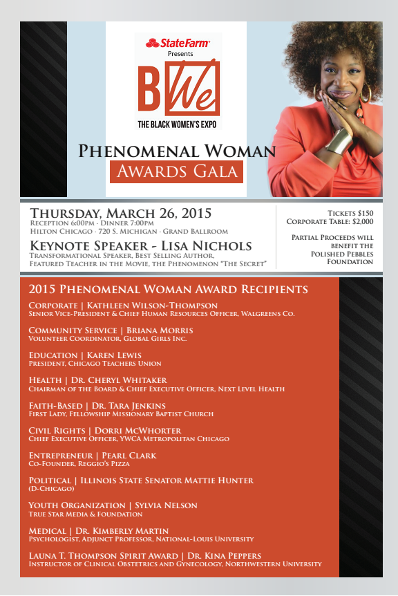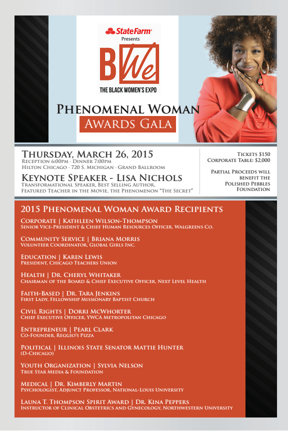 She is awarded the 2015 Phenomenal Woman Award because of her outstanding achievements in community service. This award pays tribute to African American women that have distinguished themselves throughout the city of Chicago, and beyond. Awardees are honored for providing exemplary service to the African American community, by inspiring others to follow in their footsteps, and quite simply, for being PHENOMENAL! Former recipients have included Oprah Winfrey, Dr. Maya Angelou, Winnie Mandela, Linda Johnson-Rice, Reverend Willie Barrow, Juanita Jordan, Iman, and many more.